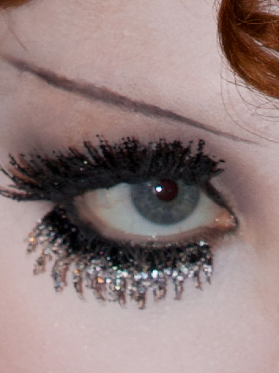 - M·A·C スタック マスカラで無限のボリュームと長さをプラス。その後、上まつ毛と下まつ毛に#76 スーパーモデル ラッシュと#80 ロマンティック ラッシュを装着し、ダズルシャドウ リキッド アイシャドウを使ってグリッターを毛先に固定。